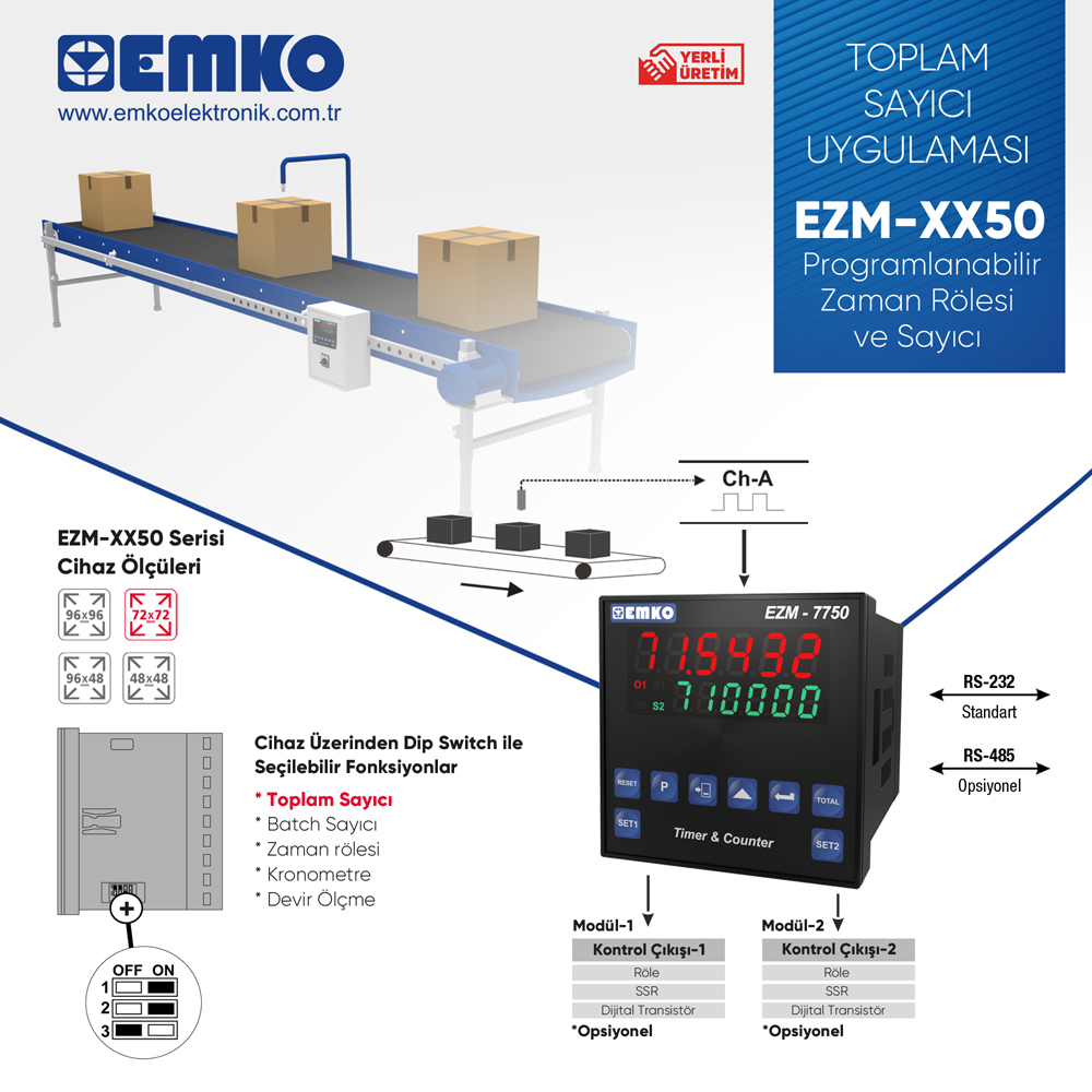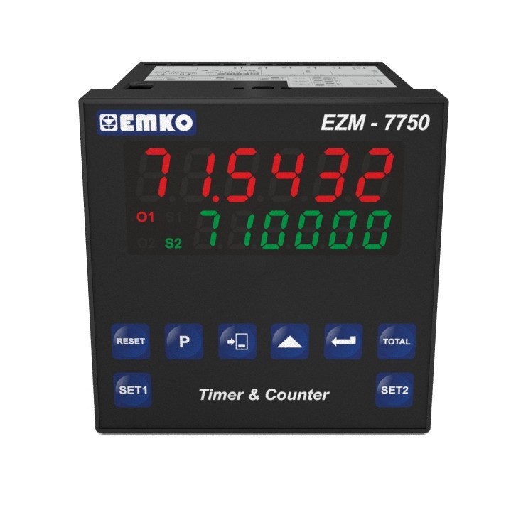 EZM-7750 Çok Fonksiyonlu Programlanabilir Zaman Rölesi ve Sayıcı EZM-XX50 Konfigure edilebilir, Toplam Sayıcı, Batch Sayıcı, Zaman rölesi, Kronometre, Frekansmetre ve Devir Ölçme fonksiyonları Otomatik ve Manuel Resetli çalışma Zaman rölesi ve Kronometre için programlanabilir zaman skalaları (sn, dk, saat) Çarpım faktörü ve desimal nokta pozisyonu 6 Dijit proses (PV) ve 6 Dijit Set değeri (SV) göstergesi İki Setli Çalışma Output Modül Sistemi Reset, Pause ve ChA-ChB sayma girişleri Otomatik ve Manuel Resetli çalışma Sayıcı fonksiyonunda INC, DEC, INC/INC, INC/DEC, UP/DOWN, x1 / x2 / x4 faz kaymalı sayma seçeneği Modbus ASCII or RTU Protokolüyle, RS-232 (standart)